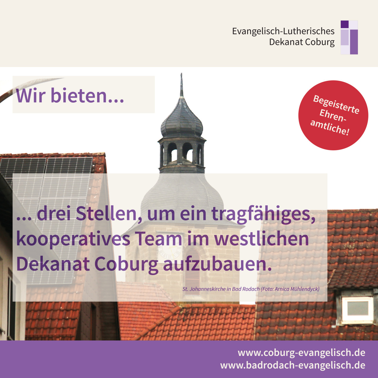 Acht idyllische Kirchengemeinden in Oberfranken, jedes mit eigener Kirche und einem gemeinsamen Kirchenvorstand, rund 3.600 Kirchenmitglieder, motivierte Mitarbeitende in den Kirchengemeinden, gute Anbindung an das Dekanat Coburg. Gefragt sind Menschen, die Lust haben, ein tragfähiges Hauptamtlichen-Team für die Pfarrei aufzubauen. Besonderer Bonus: Derzeit wird in Bad Rodach die Salvatorkirche in ein neues, gemeinsames Pfarramt mit Gemeindezentrum umgebaut.